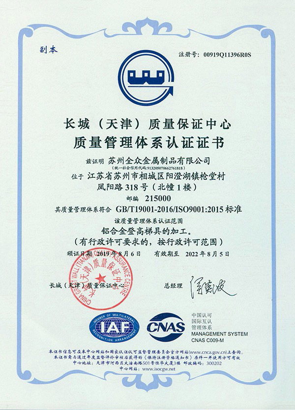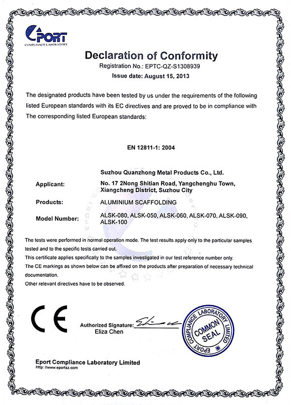 苏州全众金属制品有限公司专注铝合金制品的开发“产品就是人品”的企业理念,不断进行技术创新、设备创新、服务创新、和管理方式创新来继续研发出更多满足未来发展需要的产品, 公司产品通过欧盟认证取得CE认证并取得证书,铝合金脚手架系列产品通过SGS认证,铝合金平台和梯具类产品均严格按照GB12142-2007,GB17888等标准设计生产。